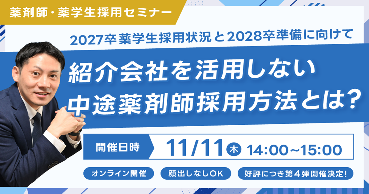 【無料セミナー開催】2027卒薬学生採用状況と2028卒採用準備/紹介会社に頼らない薬剤師採用戦略とは?