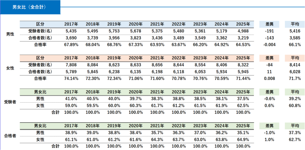 ・合格者数の推移: 仮に合格ボーダーラインが前回同様の213点となった場合、合格者数は9,100名前後になると予測されます。これは昨年の実績よりも60名ほど少なくなる計算であり、企業が採用できる新卒薬剤師の母集団そのものが縮小している現実を示しています。 また前回は過去10年で薬剤師国家試験合格をした男性が最小だったデータ(女性は例年通り)というデータもあるので、今回はどういう形になるのかもポイントになってきます。