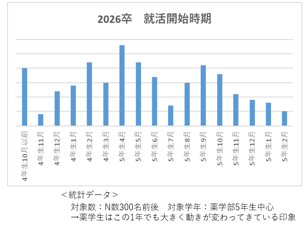 最新の統計データによると、薬学生の就活開始時期は年々早まっており、5年生の4月には大きなピークを迎えます。